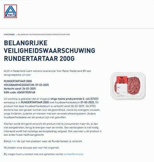 Supermarktketen ALDI roept een specifieke partij rundertartaar terug omdat er een schadelijke bacterie in kan zitten. Klanten die het product hebben gekocht, wordt dringend geadviseerd het niet te eten en terug te brengen naar de winkel.