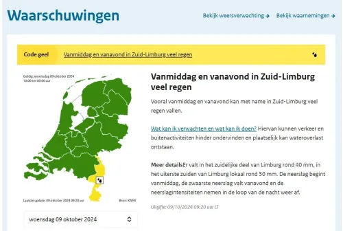 De restanten van ex-orkaan Kirk zullen hier flinke regenval en onweer brengen, wat heeft geleid tot een waarschuwing van het KNMI met code geel. In de middag en avond wordt er in Limburg langdurige regen verwacht, met kans op 20 tot 50 millimeter neerslag.