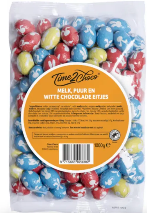 Het gaat om de grote kilo-zakken ‘Melk, Puur en Witte Chocolade Eitjes assorti’. Op de verpakking staat nergens vermeld dat er hazelnoot in kan zitten, maar die blijkt er tóch in te zitten. En dat is slecht nieuws voor mensen die daar allergisch voor zijn.