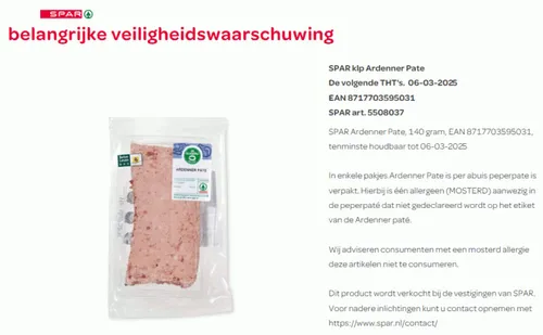 Supermarktketen SPAR waarschuwt klanten dat in sommige verpakkingen van de Ardenner Paté per ongeluk Peper Paté is verpakt. Dit kan een risico vormen voor mensen met een mosterdallergie, omdat de Peper Paté MOSTERD bevat, terwijl dit ingrediënt niet op het etiket van de Ardenner Paté vermeld staat.