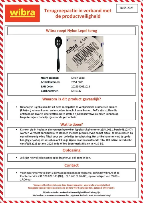 De winkelketen Wibra heeft een dringende terugroepactie aangekondigd voor een nylon keukenlepel die eerder in Nederland en België is verkocht. Klanten wordt met klem geadviseerd het product onmiddellijk niet meer te gebruiken vanwege mogelijke gezondheidsrisico’s.