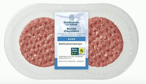 Supermarktketen PLUS roept de PLUS Boerentrots Biefstuktartaartjes Blonde d'Aquitaine 2 stuks en 4 stuks terug.