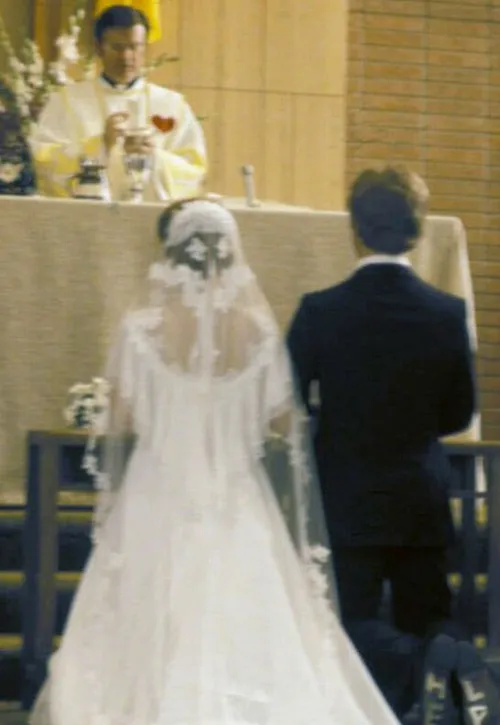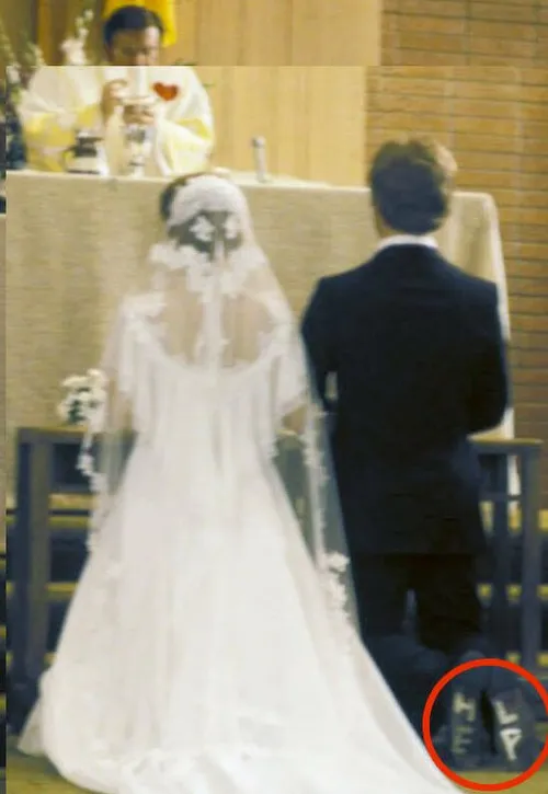 Op deze foto hebben we een stel dat knielt bij het altaar om te trouwen. Het is een prachtige scène, maar er gebeurt iets vreemds beneden.