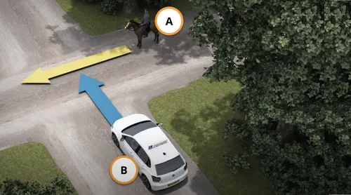 Het bovenstaande scenario kan verwarrend zijn. Het scenario toont een auto en een paardrijder in een bosrijke omgeving. Wie mag eerst verplaatsen?