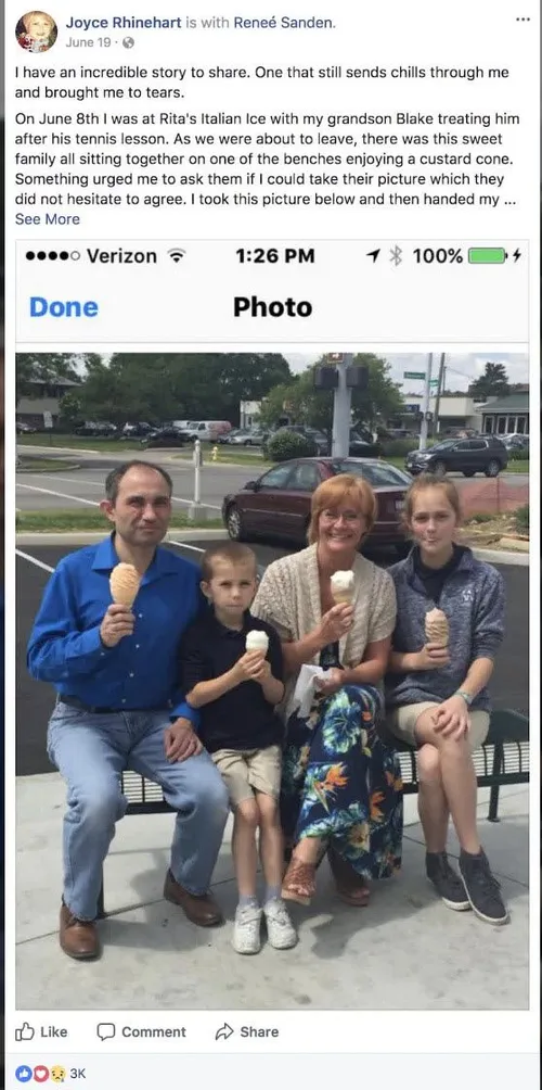 "Op 8 juni was ik bij Rita's Italian Ice met mijn kleinzoon Blake om hem te trakteren na zijn tennisles. Toen we op het punt stonden om te vertrekken, was er deze lieve familie die allemaal samen op een van de banken zat te genieten van een custard-ijsje. Iets drong bij mij aan om hen te vragen of ik hun foto kon nemen..."