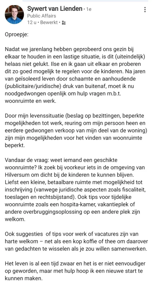 Met een opmerkelijk openhartige post vertelt Van Lienden dat hij volledig aan de grond zit. Zijn huwelijk is voorbij, zijn woning is verkocht, en op zijn bezittingen rust beslag. "Ik zoek een kleine, betaalbare plek om te wonen in de buurt van Hilversum. Zelfs een kamer bij iemand thuis zou al helpen," schrijft hij.
