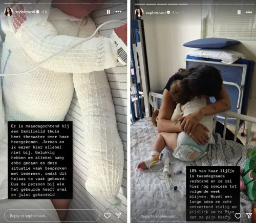 Terwijl Sophie en haar partner Jeroen afwezig waren, raakte het meisje bij een familielid gewond. Elodie werd naar het brandwondencentrum in Nijmegen gebracht, waar ze een nacht op de intensive care doorbracht. Inmiddels ligt ze op de kinderafdeling, met tweedegraads brandwonden over 18% van haar lichaam. Ze zal zeker tot volgende week in het ziekenhuis moeten blijven.