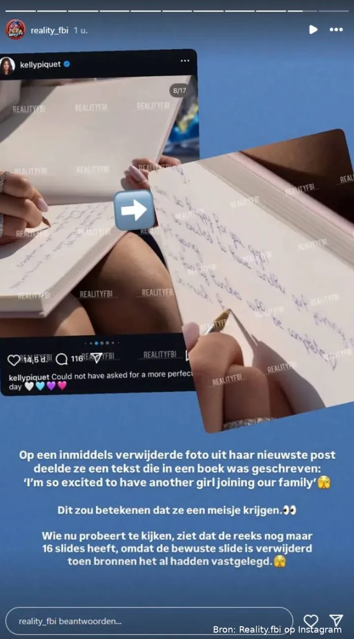 Maar pas echt opvallend was een afbeelding die Kelly zelf op Instagram plaatste. Tussen de beelden van het feest dook kort een foto op van een roze boek met de tekst “I’m so excited to have another girl joining our family.” Het bericht werd snel weer verwijderd, maar niet snel genoeg om screenshots en roddels te voorkomen. Een screenshot van de foto tref je hieronder aan.