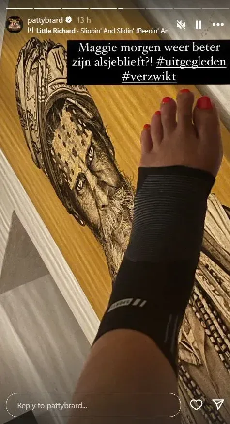 Volgens haar bijschrift is Patty uitgegleden en heeft ze haar enkel verzwikt. De precieze toedracht van het incident is niet helemaal duidelijk, maar uit de hashtags die ze heeft gebruikt, kunnen we opmaken dat het om een valpartij gaat.