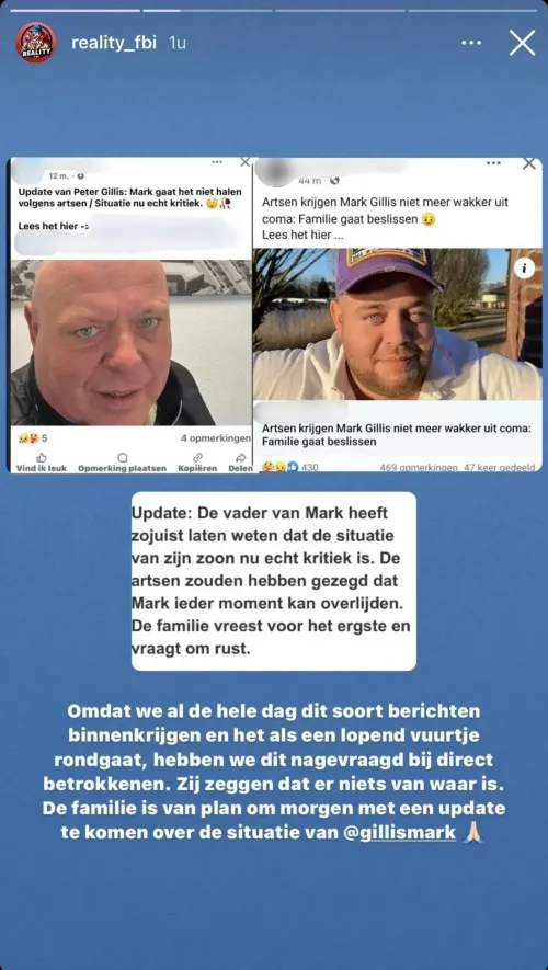 Op sociale media en diverse websites circuleren ondertussen onjuiste berichten over Marks gezondheidstoestand. Er zijn valse claims dat Mark elk moment kan overlijden en dat de artsen hem niet meer uit de coma kunnen halen. Deze berichten zijn niet waar, zoals bevestigd door de familie en via navraag door het kanaal Reality.FBI.